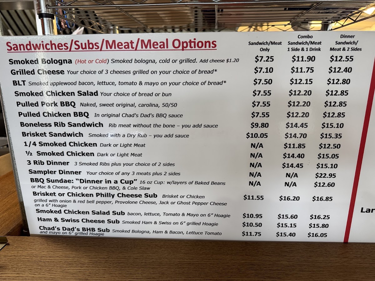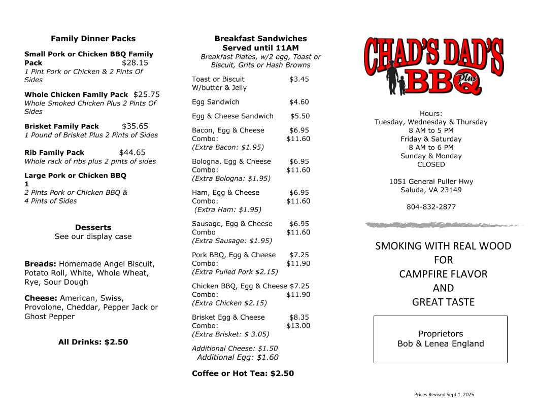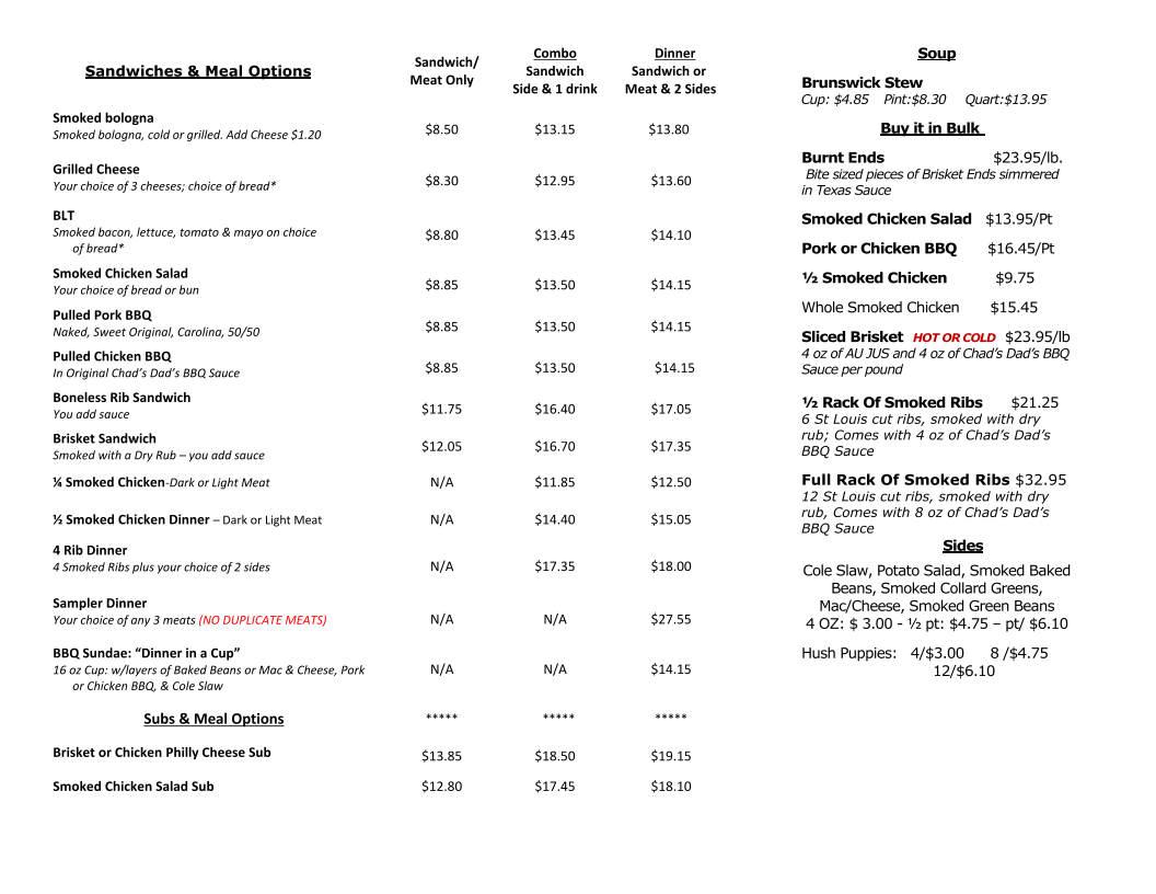 The menu at Chad's Dad's BBQ Plus offers a straightforward, comforting selection rooted in classic barbecue traditions. It’s the kind of place where hearty, satisfying meals are served in a relaxed, family-run setting, making it easy to enjoy casual lunches, weekend dinners, or friendly gatherings.