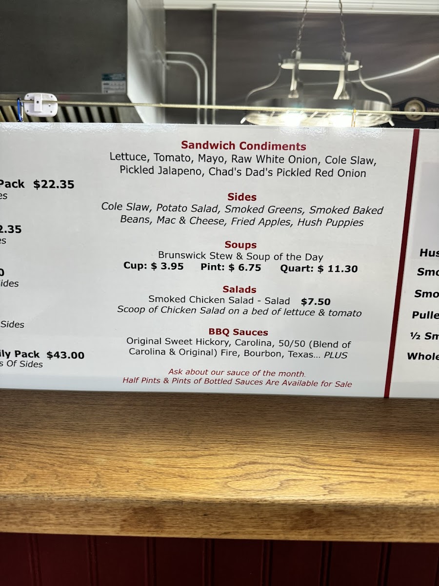 Visitors can expect familiar favorites like smoked brisket sandwiches, pulled pork Carolina style, and whole smoked chicken, paired thoughtfully with traditional sides such as coleslaw and hush puppies. The menu also includes generous family packs, perfect for sharing when you're dining with a group or looking to bring home a taste of Southern barbecue to enjoy at your own pace.